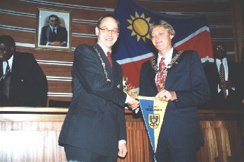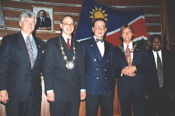 ![]() Nach der Unterzeichnung der Städtepartnerschaft: (v.l.) stellv. Bürgermeister Heinz Messner und Bürgermeister Lothar Wölfle, Botschafter Schumacher, Bürgermeister v.Finckenstein, Matthew Shikongo |
